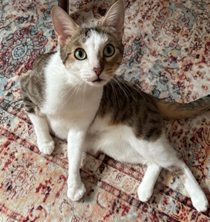 I'm a domestic shorthair kitty with a beautiful white and brown tabby coat.