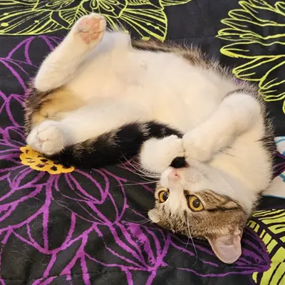 I'm a domestic shorthair kitty with a beautiful brown tabby and white coat.