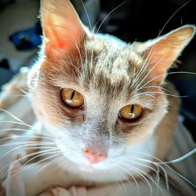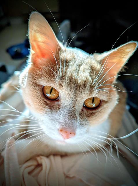 I'm a domestic shorthair kitty with a beautiful fawn tabby and white coat.