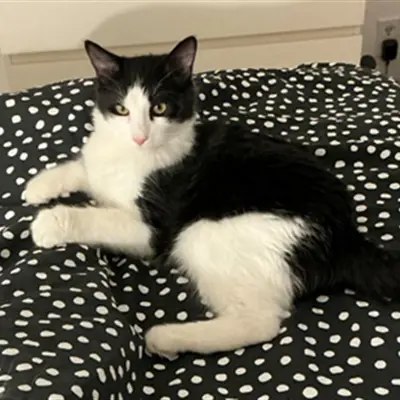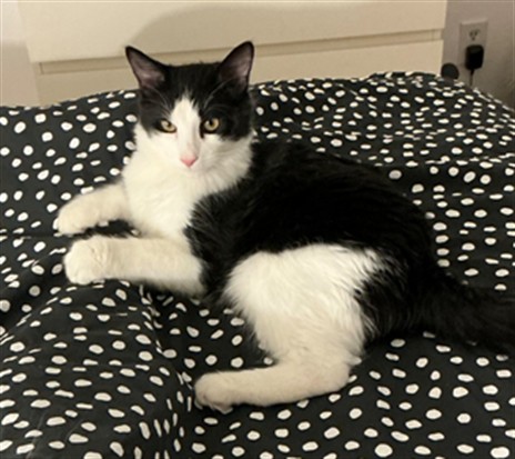 I'm a domestic medium hair kitty with a beautiful black and white coat.