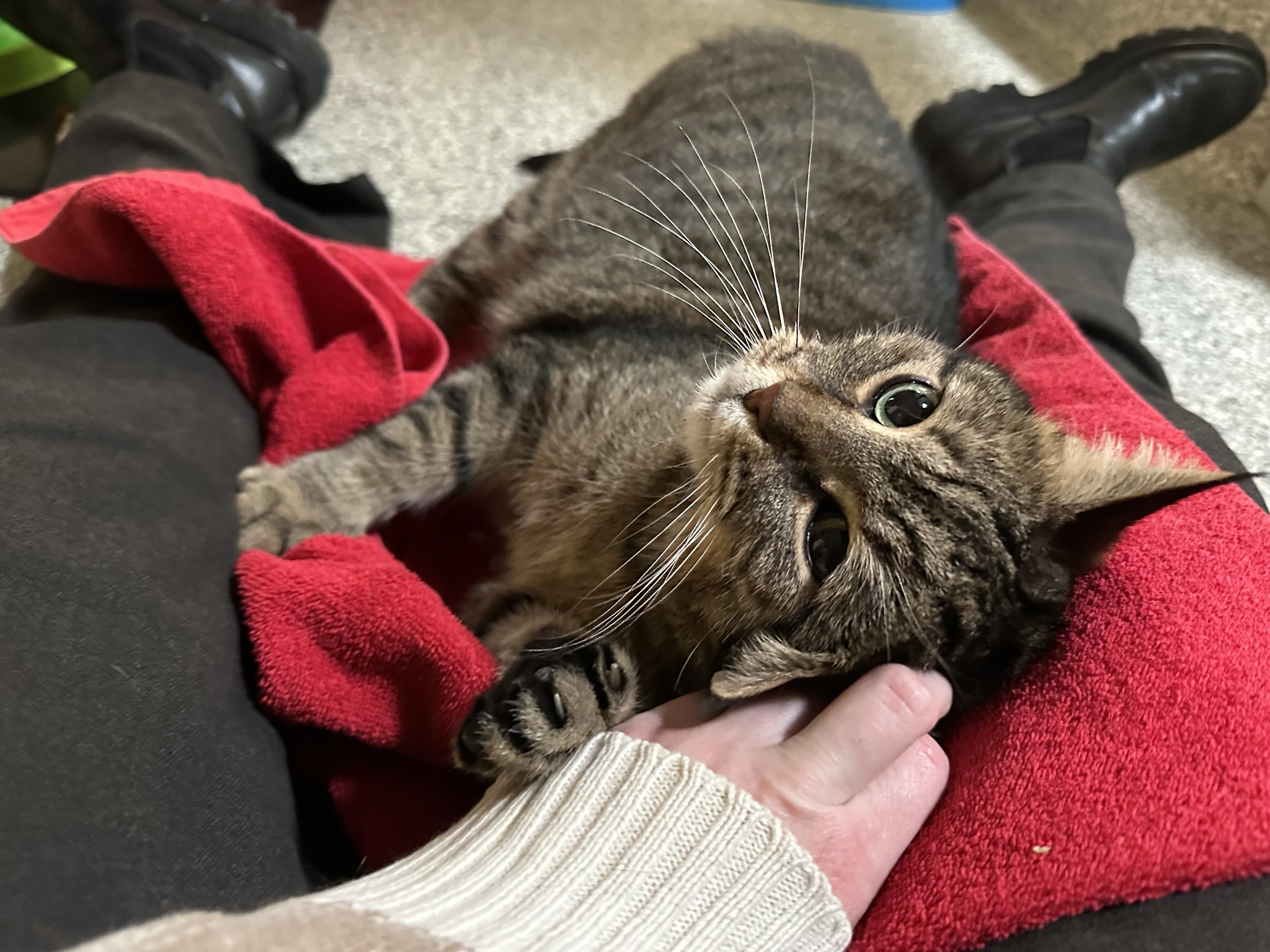 The staff at the OHS call me a Poet! Did you know that Poets thrive in calm, stable environments? When things are a little too new and different, these kitties have a hard time showing their true personalities. Because Poets find change so hard, they usually like lots of safe places to hide and high perches to rest on. While each Poet is a little different, things that usually bring them out of their shell include playing with their favourite toys, eating some of their favourite treats, and seeking attention from their favourite people. During periods of change, Poets need a safe refuge where they be surrounded by these favourite things.