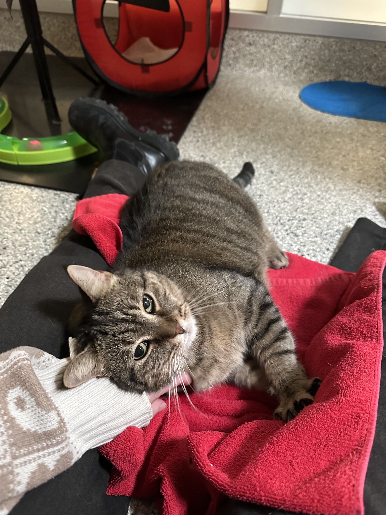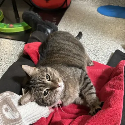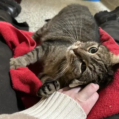 I'm a domestic shorthair kitty with a beautiful brown tabby coat.