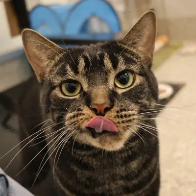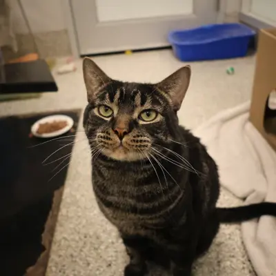 I'm a domestic shorthair kitty with a beautiful brown tabby coat.