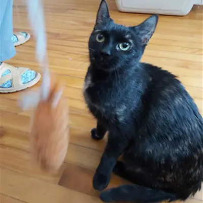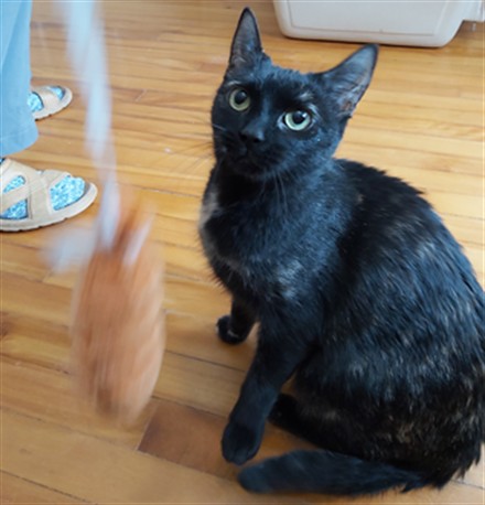 I'm a domestic shorthair kitty with a beautiful black and tortoiseshell coat.