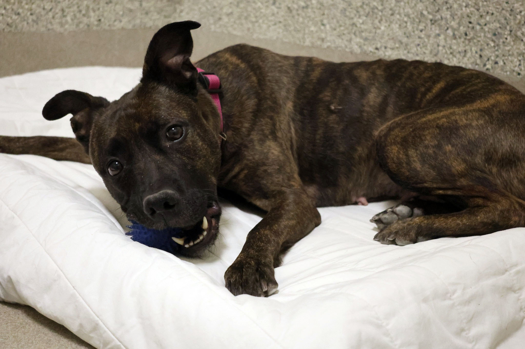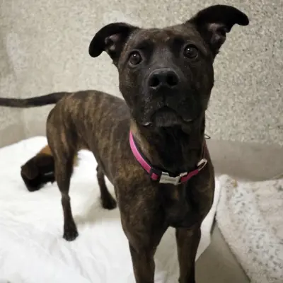 I'm a Labrador retriever mix with a short brown brindle coat.