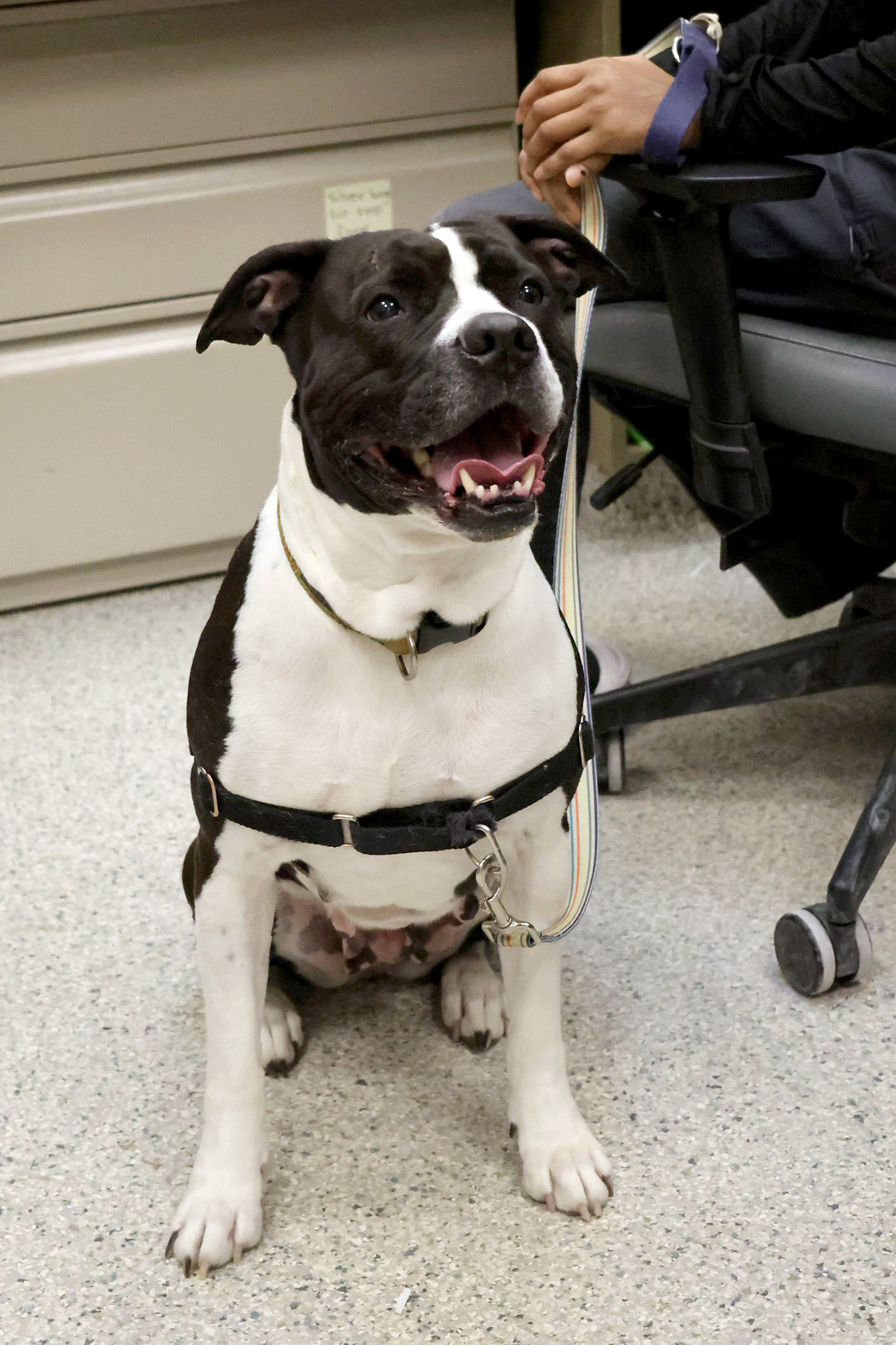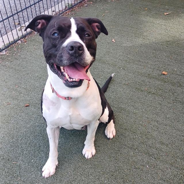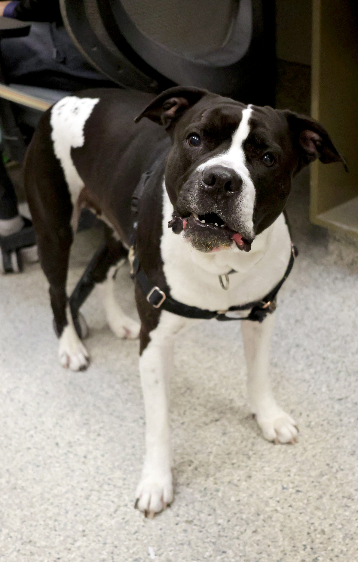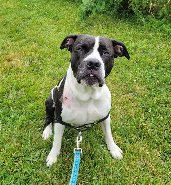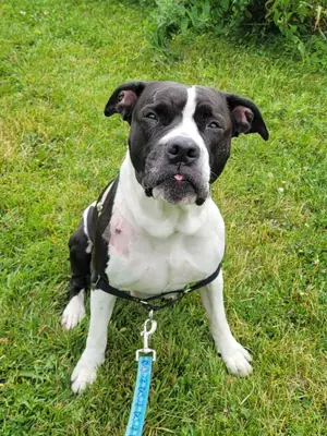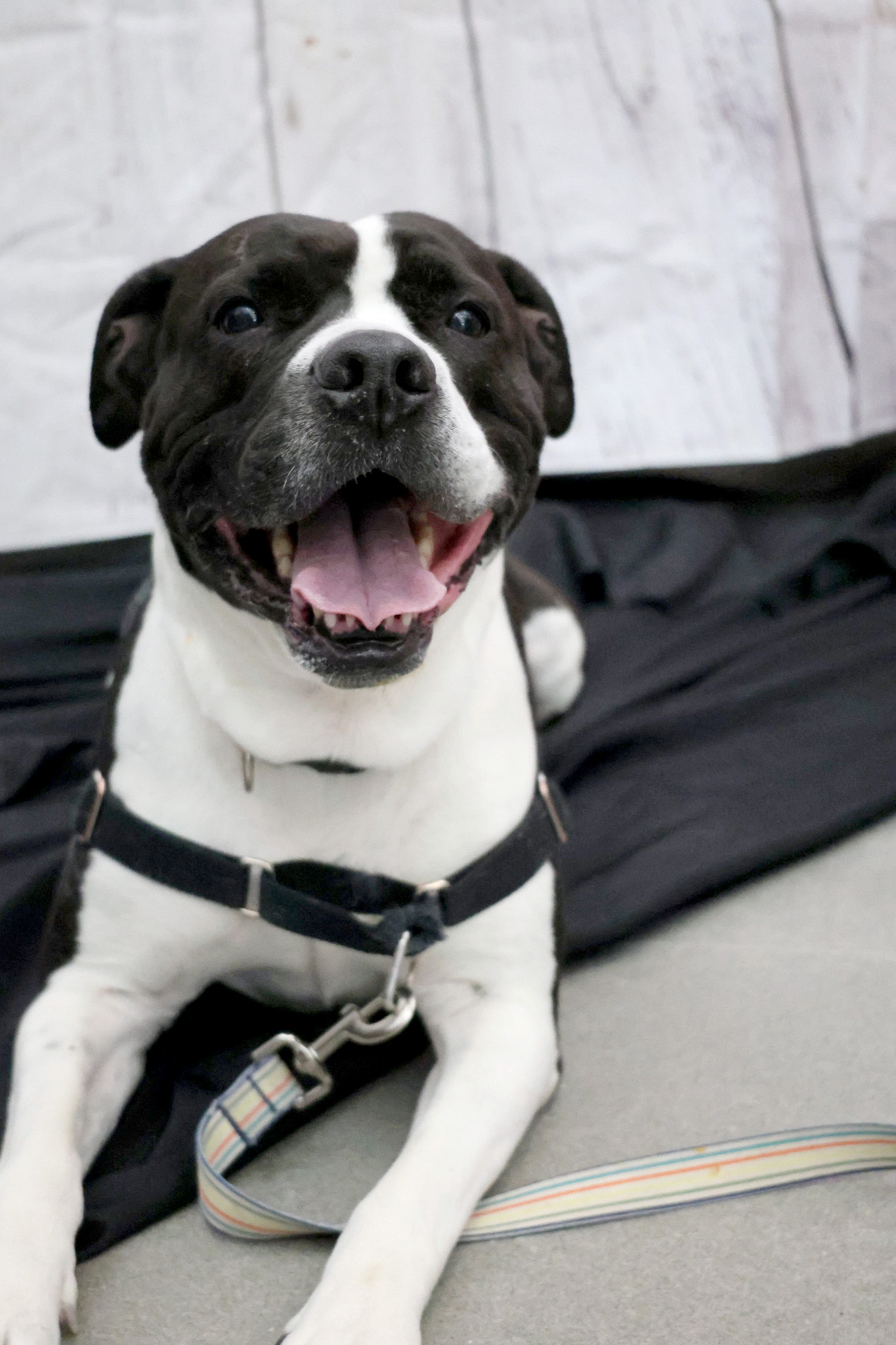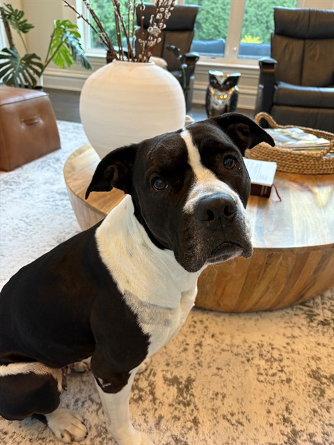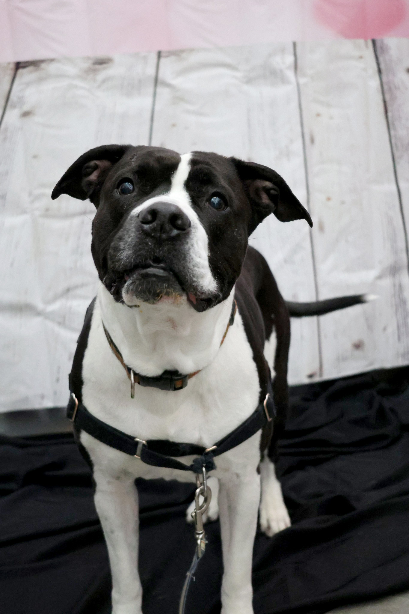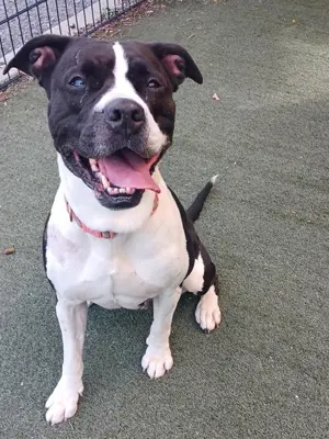 I'm a bulldog mix with a short black and white coat.