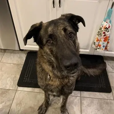 I'm a German shepherd and great dane mix with a brown brindle coat.